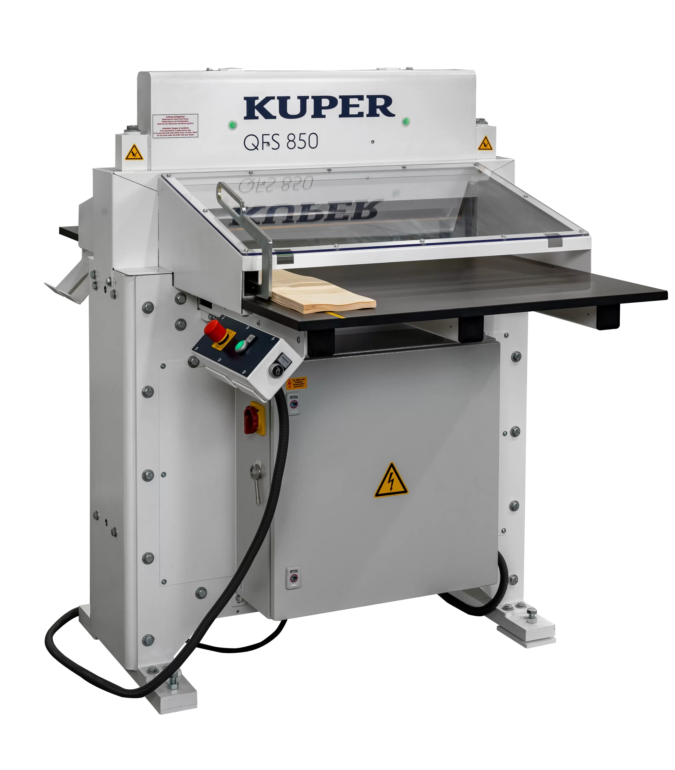 Грубые края среза? Не беспокойтесь. Наш KUPER QFS обеспечивает разрез без разрывов благодаря вертикальному движению ножа. Это делает возможным разрез без разрывов благодаря вертикальному действию ножа. Он режет очень быстро с высочайшей точностью. Независимо от того, хотите ли вы резать стопки материалов, таких как бумага или пластиковые листы, или пакеты шпона. Линия реза обозначается световой направляющей, что гарантирует особо точный разрез. Тормозной двигатель, зубчатый привод и кривошипный привод обеспечивают быстрое и мощное движение ножа: Kuper точный.