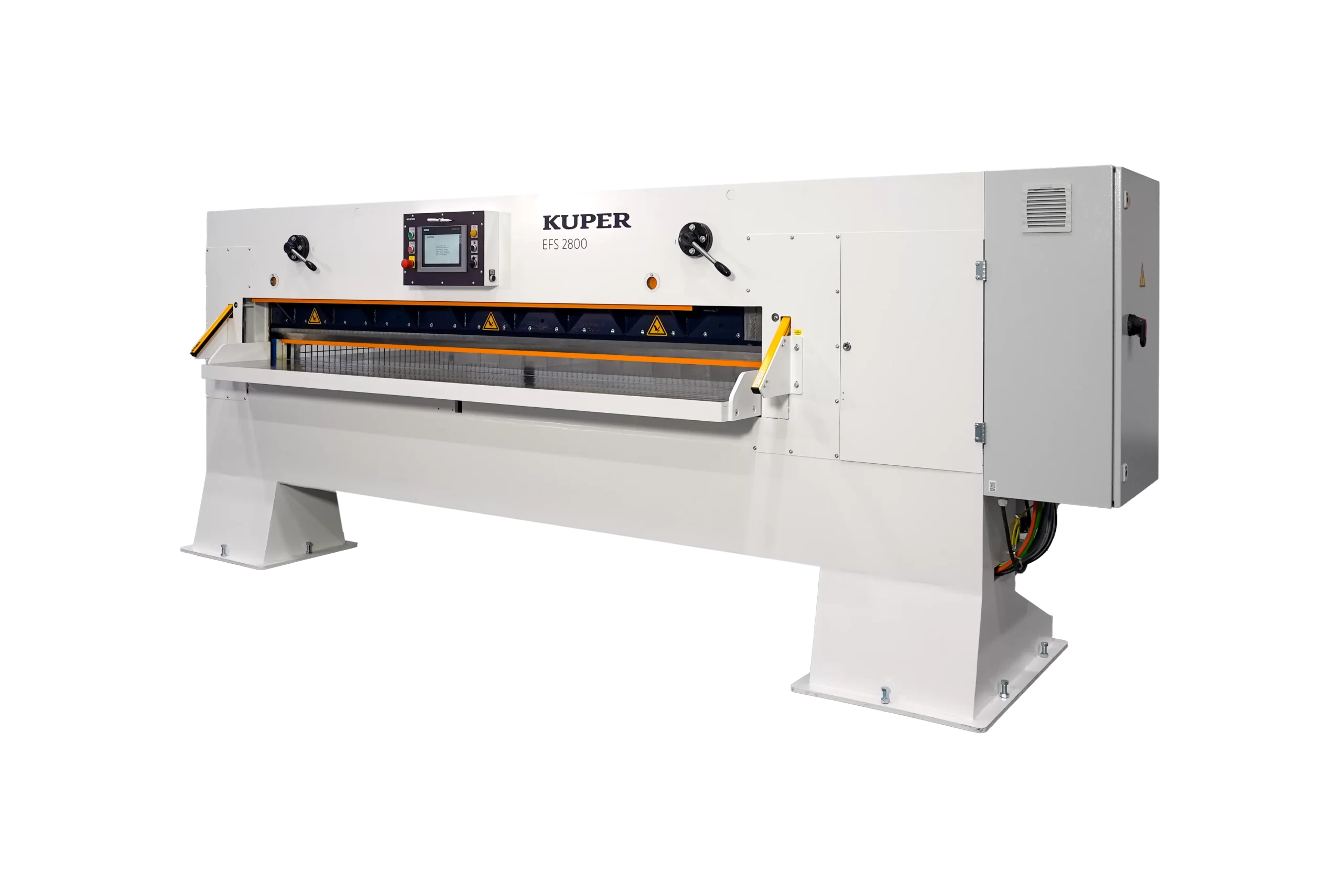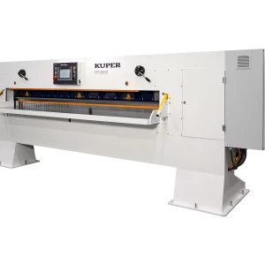 Platuma izmēri tiek iestatīti automātiski, pateicoties integrētajai pozicionēšanas vadībai. Spiediena stienis tiek nolaists, un, tiklīdz tiek sasniegts mērķa spiediens, griešana tiek uzsākta. Leņķa iestatīšana tiek ieteikta kombinācijā ar KUPER QFS šķērsgriešanas mašīnu. Atbalsta galds ar sānu žogu nodrošina pietiekamu virsmu ērtai materiāla apstrādei, pat ļoti platam materiālam.