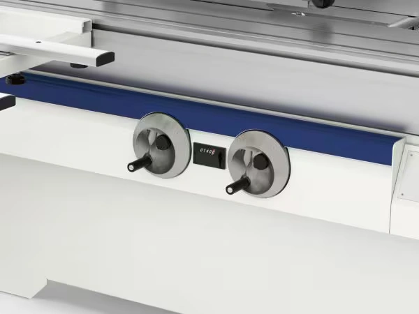 Mašīnas priekšpusē esošie rokturīši zāģa bloka pārvietošanai ir viegli lietojami; katra nelielā roktura kustība atbilst precīzai asmens regulēšanai.